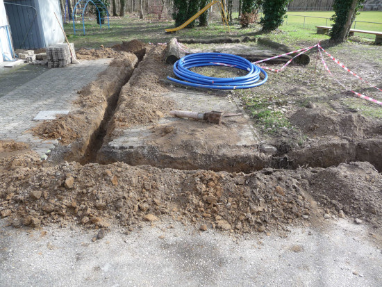 Seitens des SVS waren die Zugänglichkeit zum Brunnen und die Bereitstellung der elektrischen Anschlüsse (230 V, 400 V) sicherzustellen sowie die Leitungstrasse außerhalb der Spielfelder vorzubereiten (Sondierung vorhandener Wasser-, Abwasser, Strom- und Gas-Leitungen, Entfernen und Wiedereinbau Pflastersteine und Asphalt).