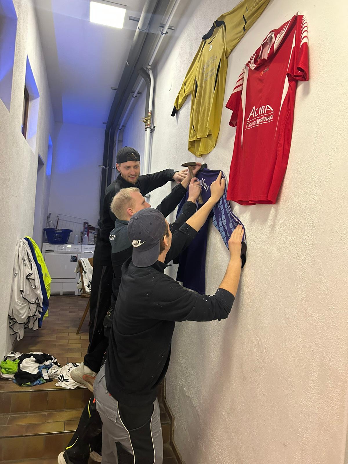 Im letzten Jahr gab es eine Vielzahl an Renovierungsarbeiten beim SV Staffort. Mitte Januar hatte die erste Mannschaft mit der Planung der Neugestaltung der Spielerkabine begonnen. Ende Januar wurde die Planung an 4 Tagen umgesetzt. Die Kabine wurde farblich neu gestaltet, natürlich ganz in den Vereinsfarben schwarz/weiß. Der neue Thekentisch in der Kabinenmitte bietet ordentlich Stauraum und ist ideal geeignet zum Abstellen von gekühlten Getränken. Abgerundet wird der Raum nun durch eine neue LED Beleuchtung. Ein weiteres Highlight findet sich im Flur zur Spielerkabine, hier wurden die „Heldentrikots“ an den Wänden aufgehängt.