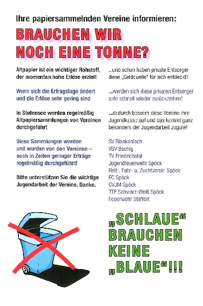 Deshalb unterstützen Sie die Vereine in Staffort / Stutensee weiterhin und lassen Sie die Finger von der „Blauen Tonne“!
