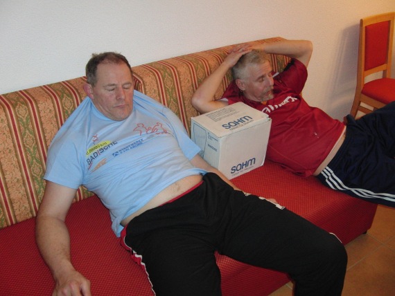 Im Laufe des Vormittags trafen wir im Skigebiet ein. Nach einem weiteren Fleischkäsevesper begaben wir uns auf die Piste und fuhren bis zum Einbruch der Dunkelheit Ski bzw. Snowboard und dies auf hervorragend präparierten Pisten. Die am Abend stattfindende Rodelweltmeisterschaft wartete mit einer Überraschung auf. Der im vergangenen Jahr an vorletzter Stelle rangierende Klaus Balog wurde in einem packenden Rennen Sieger. Zweiter Sieger wurde Michael Lorenz. Wie auf dem Bild ersichtlich, war das Rennen durchaus kräftezehrend.